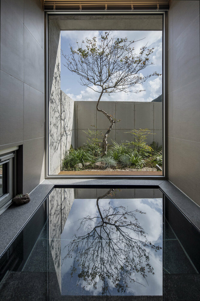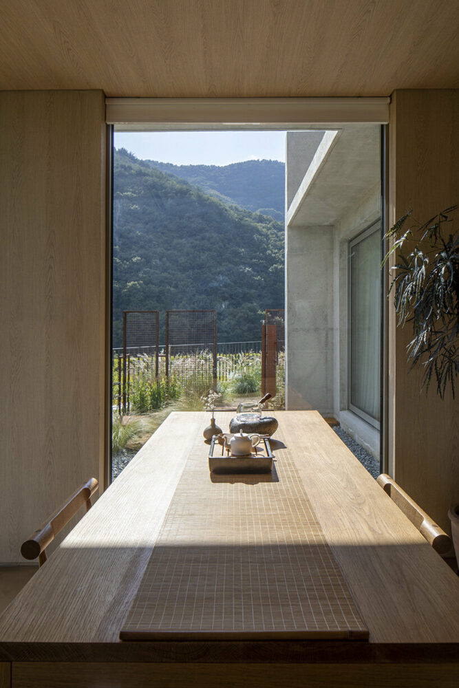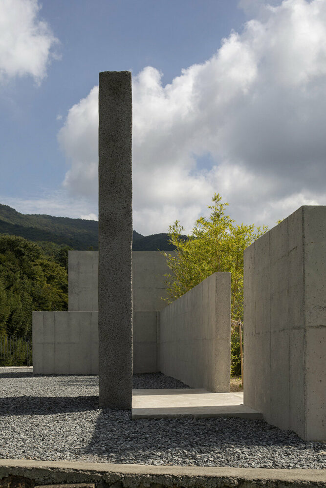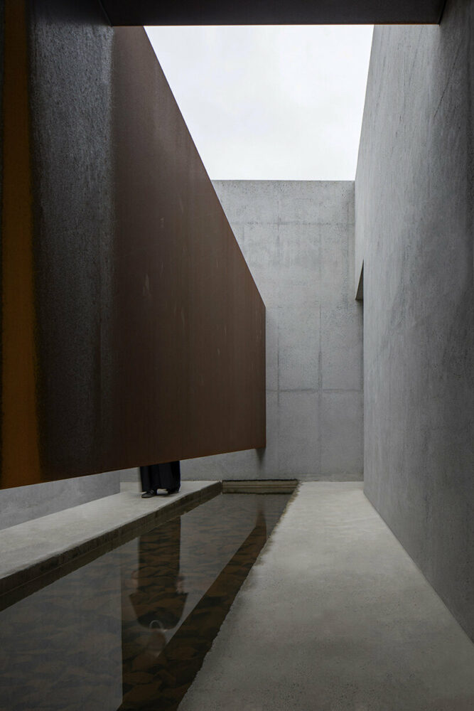 the project sits like a ring placed over the terrain, with its funnel-like roof forming a shaded perimeter walkway and an introverted core.