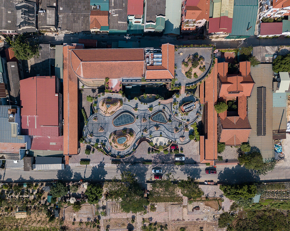 The tiered, canyon-like architecture of the Bat Trang Pottery Museum by 1+1>2 Architects (see more here) nods to the shape of potters’ wheels, mirroring the essence of traditional kilns crafted from brick. Interwoven amidst its seven inverted domes are expanses that sculpt captivating open-air spaces on the ground level. These areas serve as dynamic venues for events, exhibitions, and cherished traditional festivals. Atop the structure, skylights usher in daylight, creating an ambient coolness as warm air ascends to facilitate airflow. The four-story edifice is strategically divided, with one section dedicated to commercial enterprises and homestays. Reaching the fourth floor, a Bat Trang culinary space takes over one side, complemented by an adjacent auditorium for performing arts. A rooftop garden crowns the museum and serves as a collaborative workshop and playground.