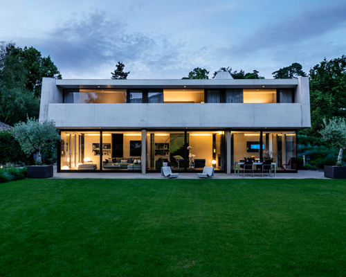 located at the edge of a rural village, in a suburb of geneva, the ‘2lb house’ by raphael nussbaumer architectes is designed for a family with a passion for brazilian architecture. the clients wanted to build there a house in a similar typological style. the sloping site faces south towards the salève mountain, which majestically overlooks the area. as is the case with most swiss regions today, the zone is under design protection, which represented quite a challenge for designing a contemporary residence. the almost obligatory position of the volume in the steepest part of the slope, limited the height of the building and the only possible access to the plot is from the south-west corner. this allow for the garden to be a central element of the project as it encloses the house softly in a protective atmosphere, and is an extension of the living room area to blur the boundary between inside and outside. the landscape and mountain range inspired the design of a solid, autonomous and mineral volume. all enclosing walls are constructed with exposed concrete and were built in one single manufacturing process in order to procure a monolithic aspect without any horizontal division.