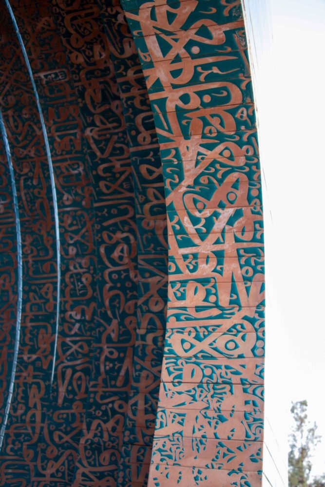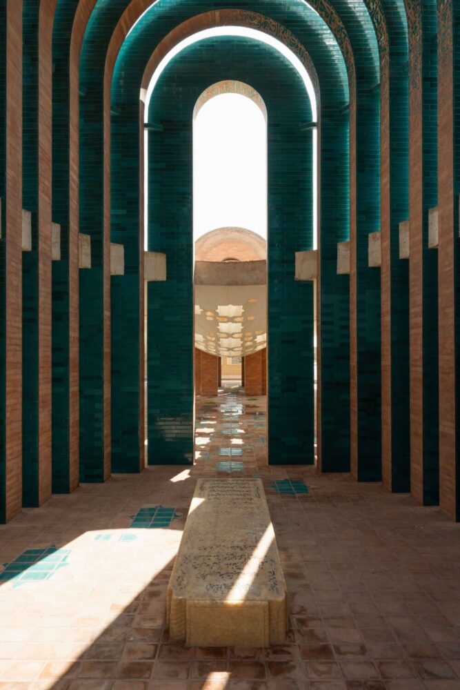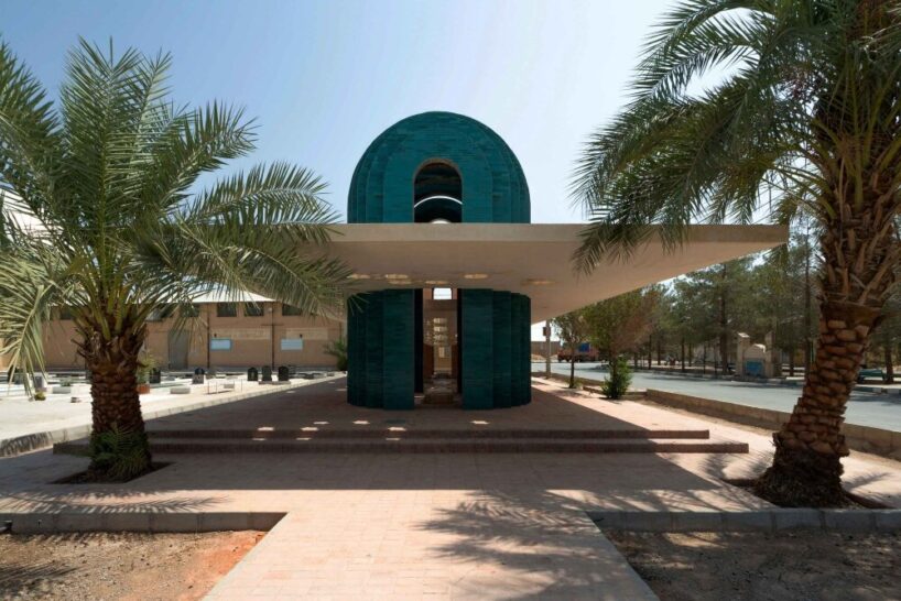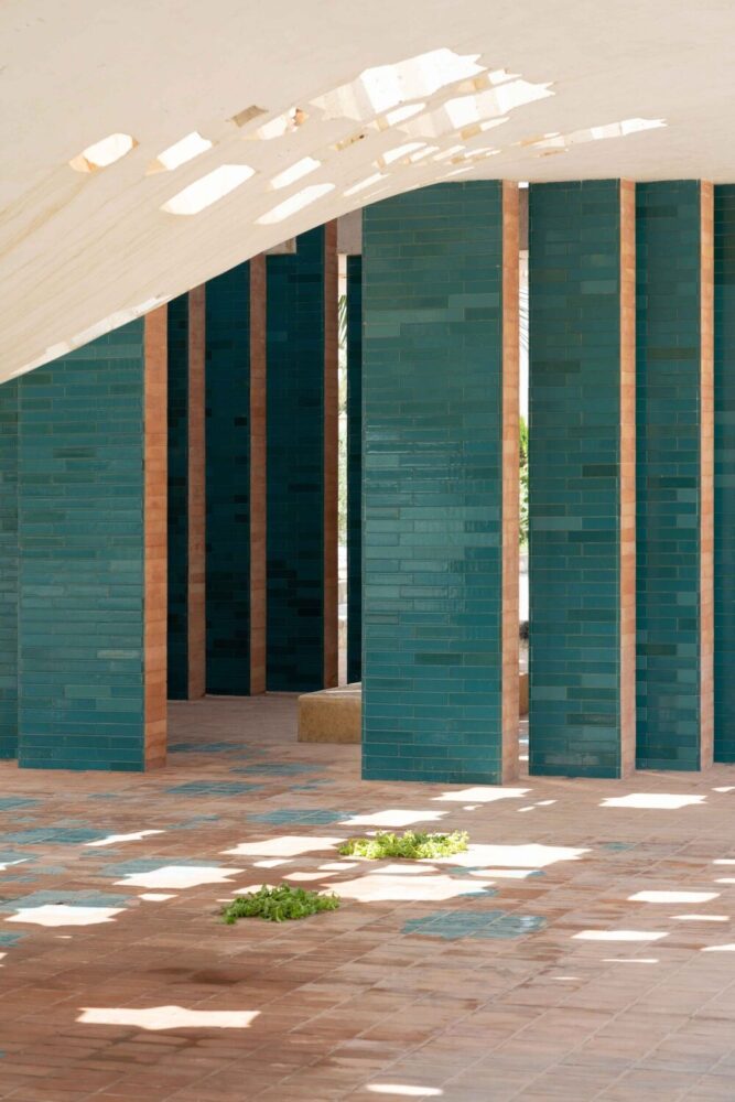 the project sits like a ring placed over the terrain, with its funnel-like roof forming a shaded perimeter walkway and an introverted core.