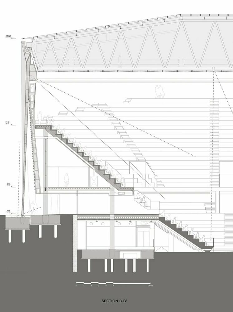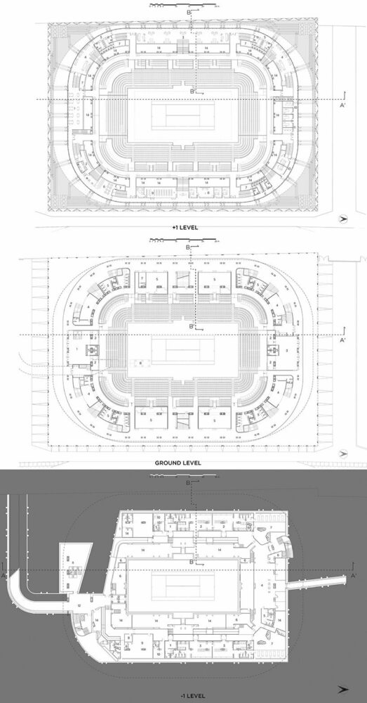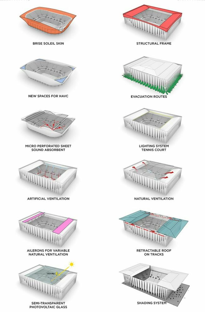 the project sits like a ring placed over the terrain, with its funnel-like roof forming a shaded perimeter walkway and an introverted core.