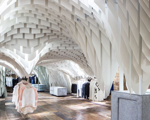 more than 10,000 pieces make up the dynamic ceiling installation to form an abstract landscape; developed through computer software. recycled timber was used on the floor and walls, while the store’s façade was left transparent to invite people to explore and view the distinctive retail space.
