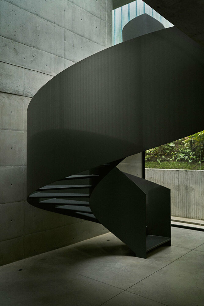 The elements that complete the space are not designed only for their beauty or plastic expression; each one fits perfectly into the space it occupies. As an example, the spiral staircase is carefully positioned to be highlighted by shadows, straight lines, and the light that falls through the skylight above it. This relationship between the objects, the space and the calculated light runs through the entire interior of the home