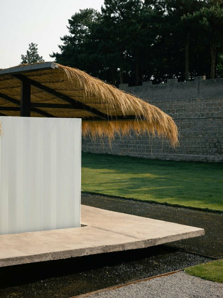 the project sits like a ring placed over the terrain, with its funnel-like roof forming a shaded perimeter walkway and an introverted core.