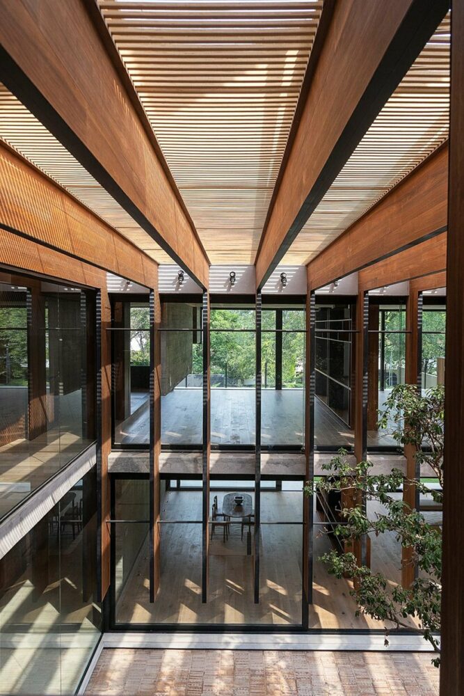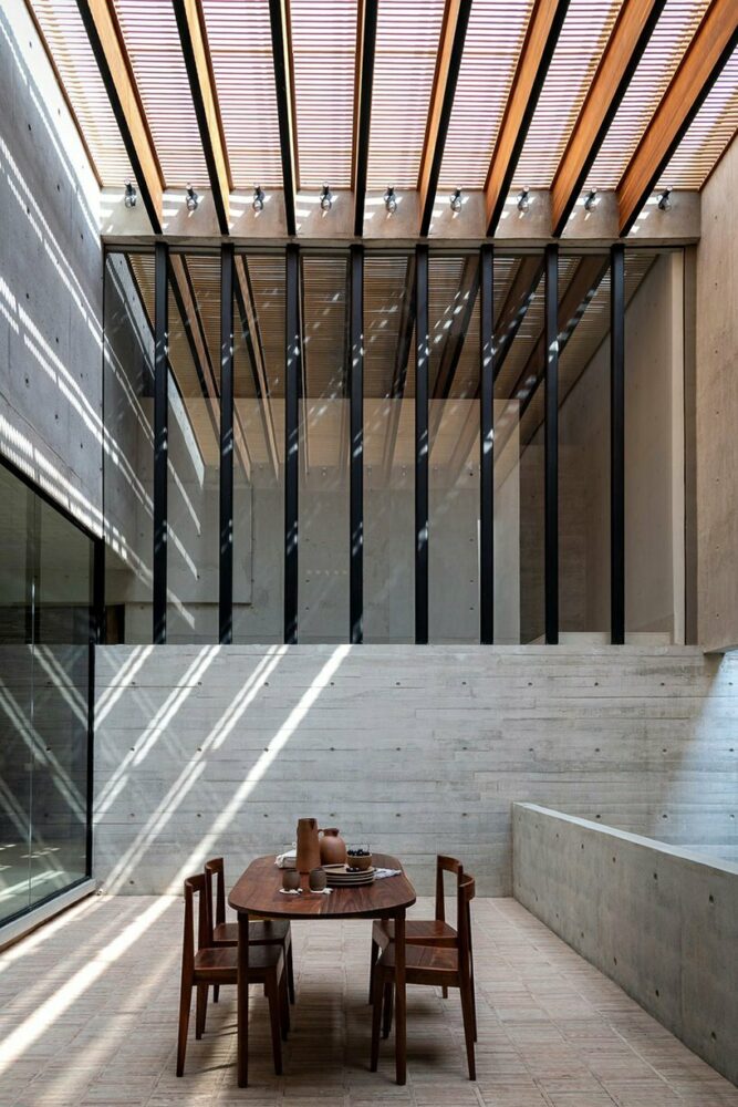 the project sits like a ring placed over the terrain, with its funnel-like roof forming a shaded perimeter walkway and an introverted core.
