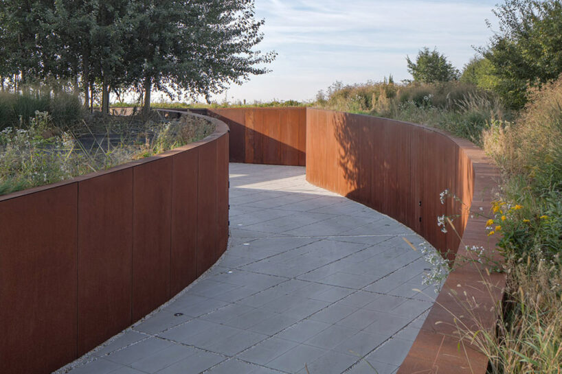 the project sits like a ring placed over the terrain, with its funnel-like roof forming a shaded perimeter walkway and an introverted core.