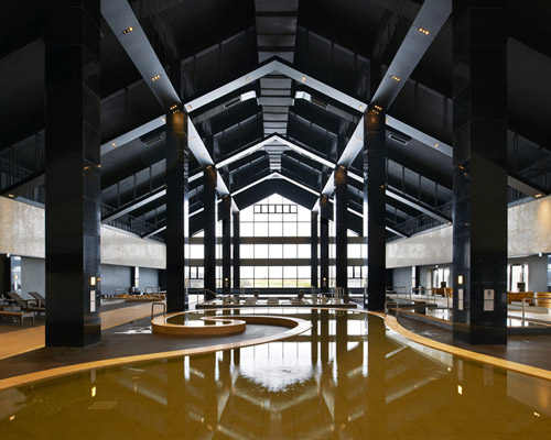 the beginning construction of the development occupies the southern portion of the 170,000m² site. as visitors walk through the doorway from the east, they arrive at the entrance hall that continues the dark color palette of the exterior. the extruded massing is covered by a layering of ceiling supports that force perspective down the elongated interior. as circulation continues, a service counter filters men and women into corresponding locker rooms and small hot springs that are concealed by barriers of trees and shrubs. in the main space, a figural pool is situated in the center as smaller water features line the perimeter for different functions that accommodate groups of all sizes.