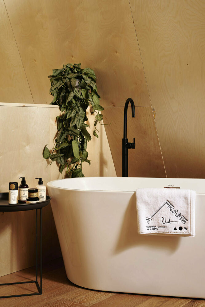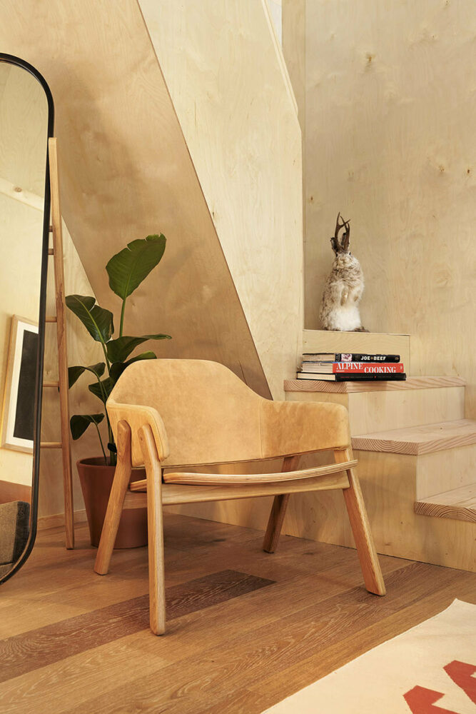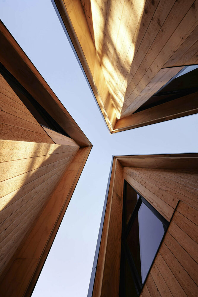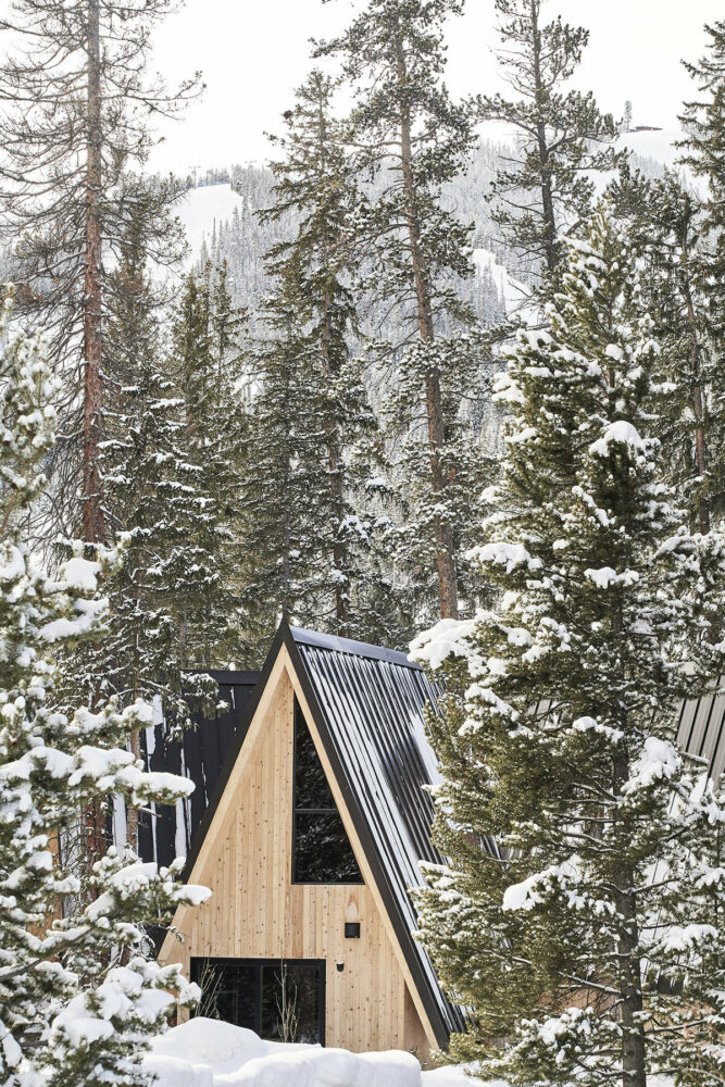 upper level bedrooms are nestled beneath the A-frame’s dramatically sloping ceiling