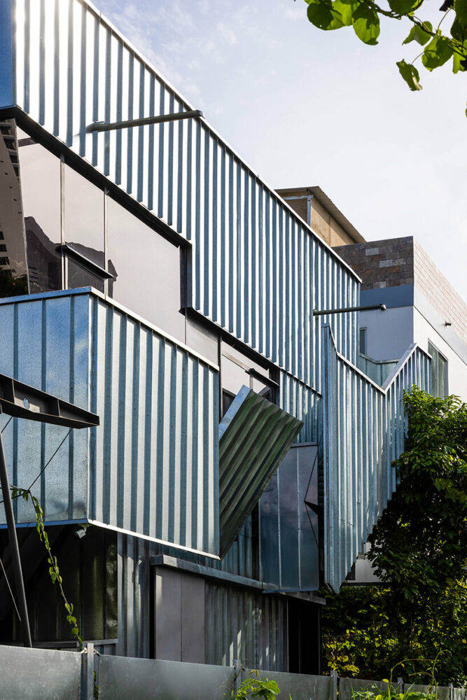 Sited on a rental plot in Ho Chi Minh, Vietnam, the TBD office is a temporary working space built from corrugated metal plates, evoking a grouping of scraps. Local practice Aaaaaa completed the 240 sqm project for a general contractor specialized in interior fittings, providing them with a practical design on stilts that creatively responds to the city’s fast-growing urban fabric and tropical weather.