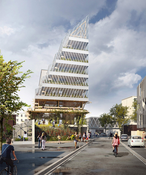 the approach to the building is designed so that visitors can easily adapt to it thanks to the creation of a public garden space. the designers are convinced that this type of proposals contributes to improving the living environment, conveyed by the production of ultra-local food, which is healthy and has the best quality. this reduces costs, CO2 emissions, and fossil energy requirements. the motivation behind the project is to start paving the way to conceive a new environment, because it is at an urban scale that it becomes possible to consider virtuous synergies between the project and people, placing them at the heart of the process.