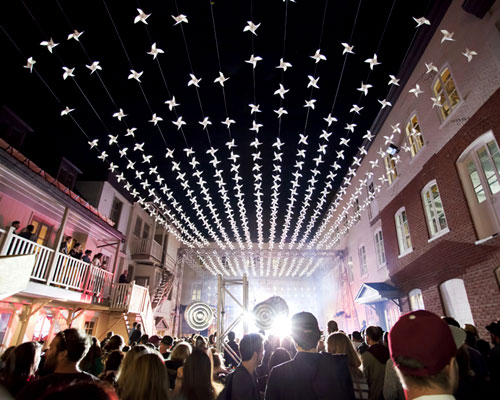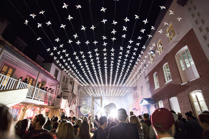 for the 2015 SPOT qc (sympathique place ouverte à tous), ADHOC architectes teamed up with a group of students to create and build an outdoor stage canopy called ‘vol-au-vent’ for the architectural event in québec city, canada. the main theme of the gathering was ‘play’, which remitted the team to their childhood years when they enjoyed games with handmade paper windmills. to recreate this feeling they decided to design an installation that would cross the venue from side to side and hang the paper objects from there.