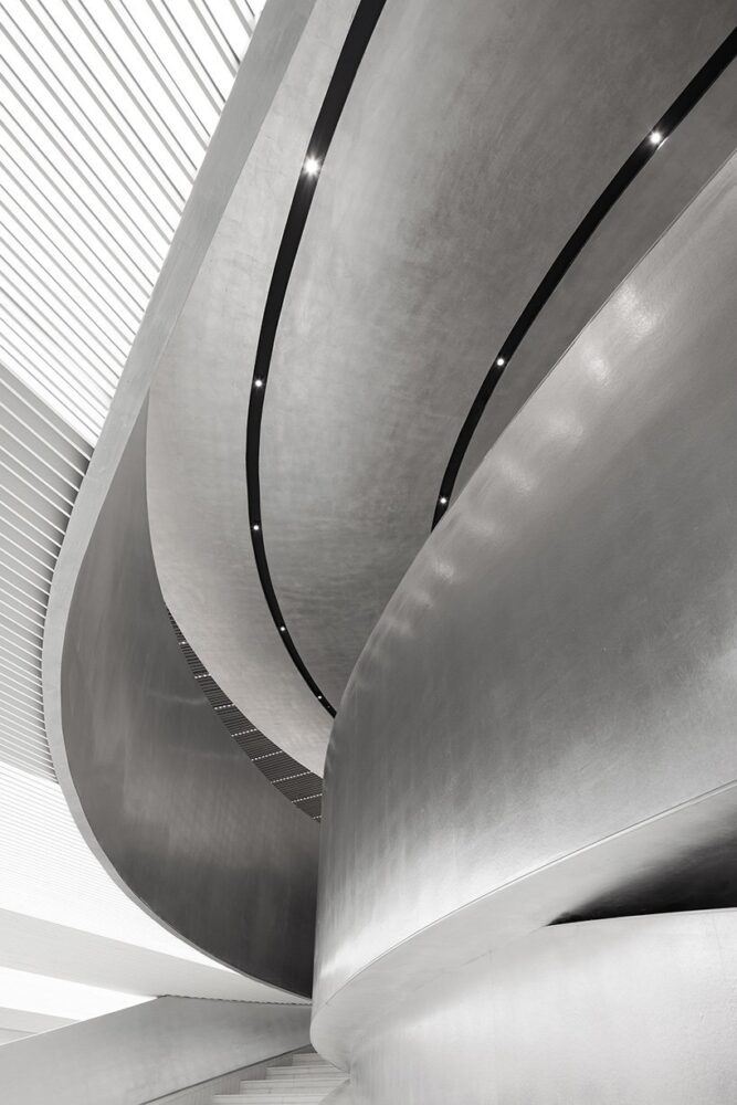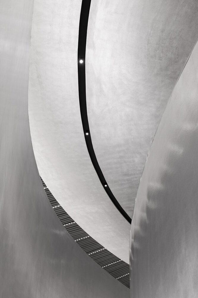 the ascending form of spatial structures is inspired by the broken bridge, a world-famous scenic spot in hangzhou. the bridge-like volume distorts and extends upwards through the black hole’s gravity, thus creating an ascending experience full of tension and strength. the bridge staircase shifts from big to small, from straight to curving, from bottom to top, and from bright to dark.