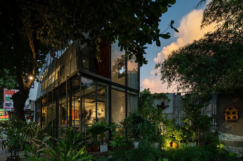 A+H architects wraps vietnam café with large, rotating glass doors + perforated steel panels