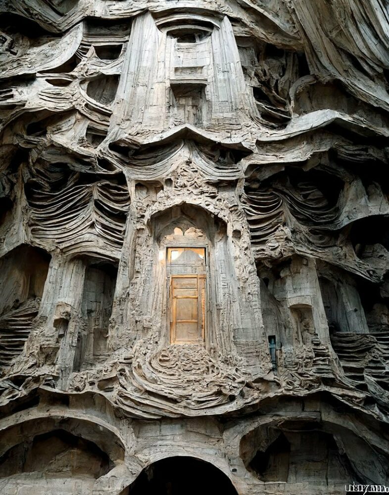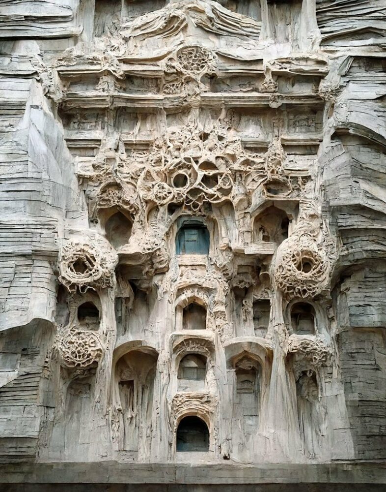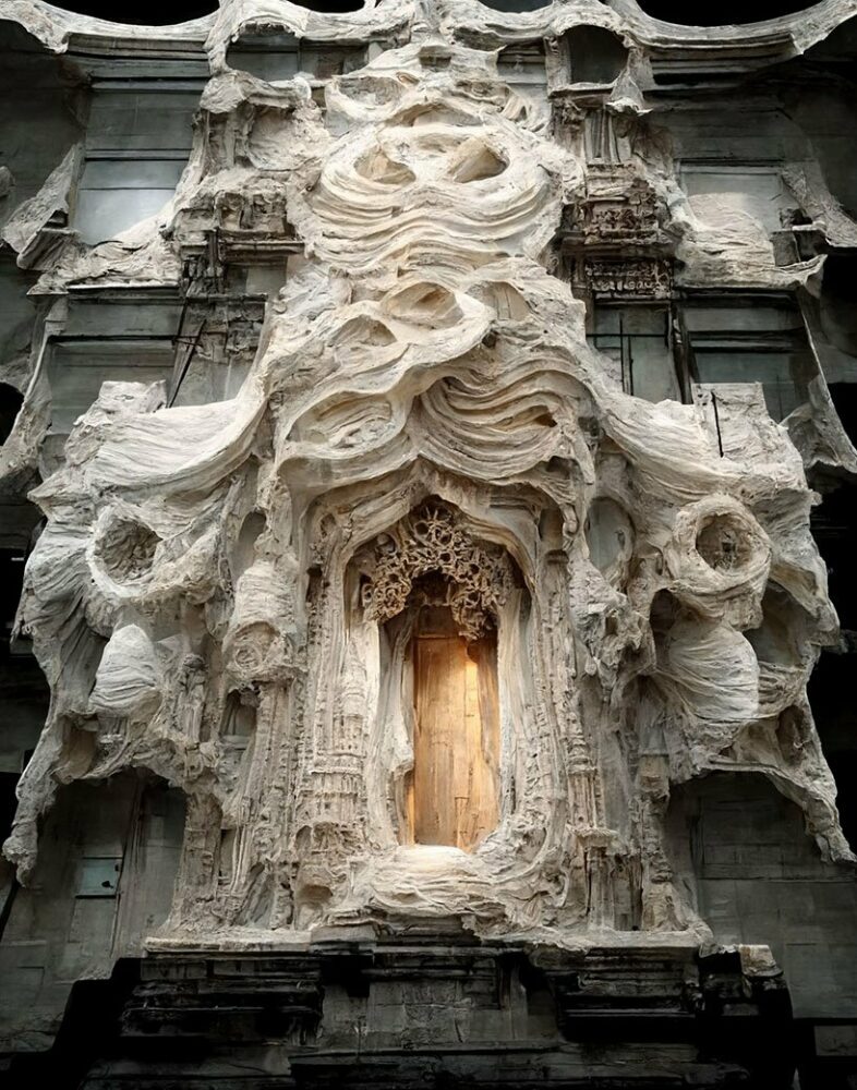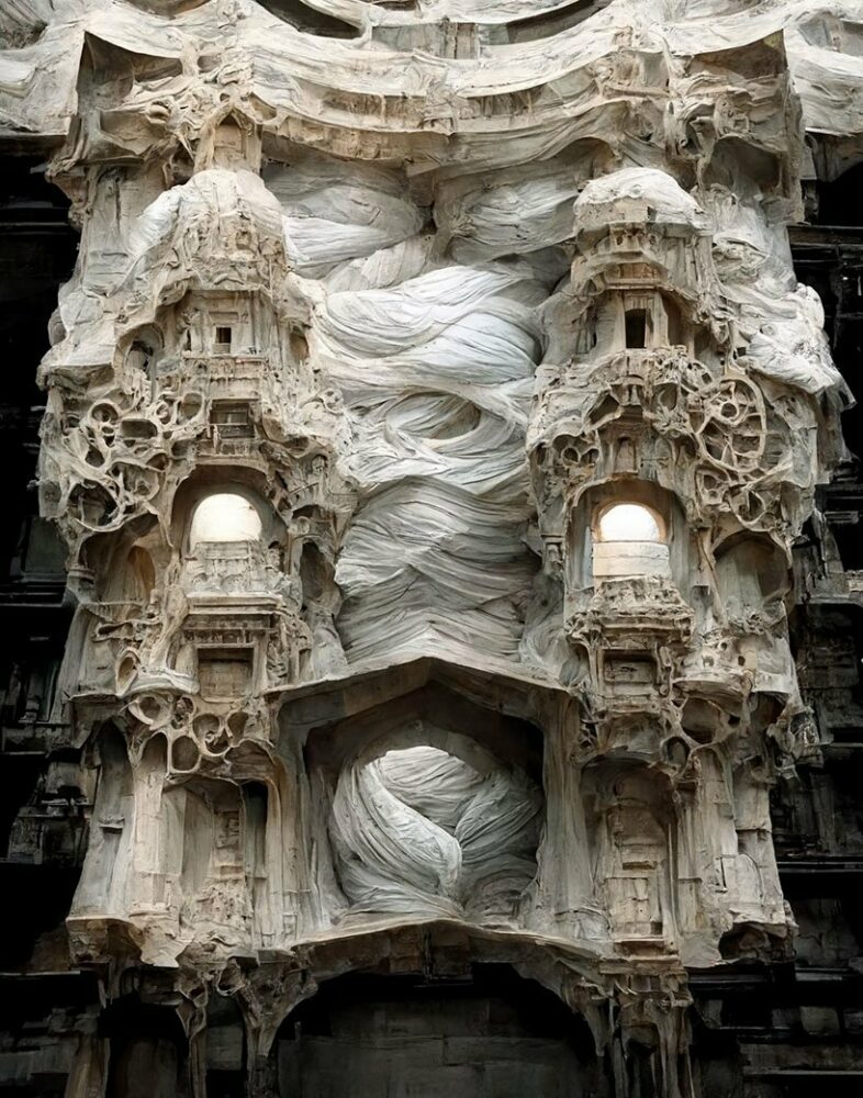 AI explorations of baroque architecture envision intricate façades made of silk and stone