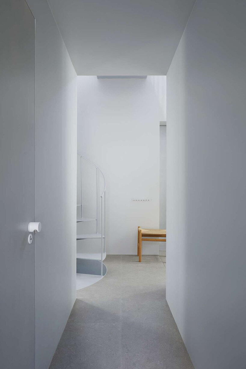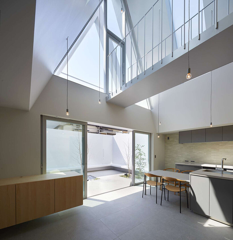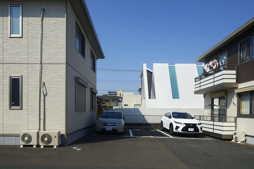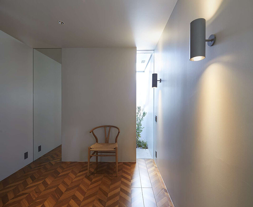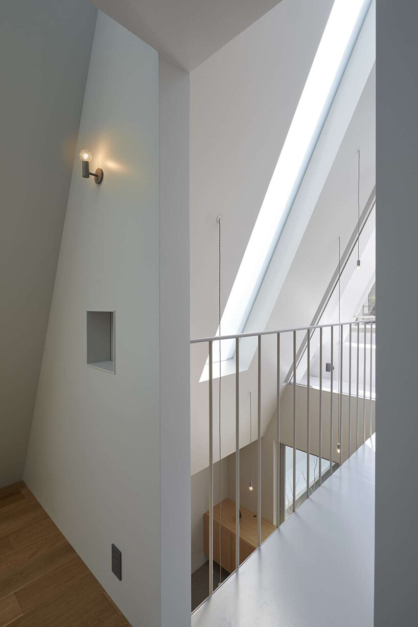 The staircase also leads to an upper level, crafted as a sharp triangular atrium illuminated by slit-shaped skylights; the light pouring in reaches the LDK and entrance on the ground floor. According to Airhouse, resorting to a sharply-angled atrium allows daylight to expand inward generously and creates a comfortable gap between ‘House in Yokohama’ and neighboring residences.a triangular atrium crowns airhouse's new private residence in japan