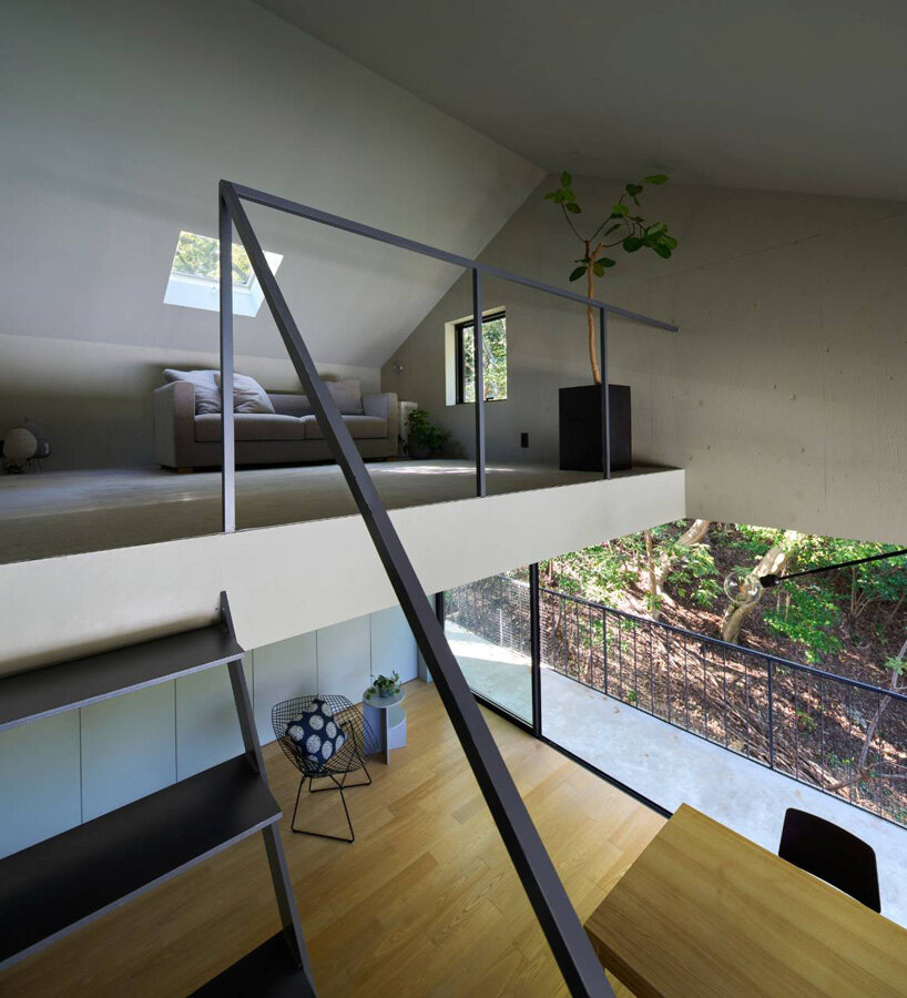 The cantilevered floor serves as the foundation for the House in Yagoto which emerges as a seemingly hovering volume emerging above the landscape and steep slope. Its dark form sits in stark contrast to its context as its outer walls clad in cedar create the appearance of a serene mountain villa. With minimal impact on the natural surroundings, the team at Airhouse was able to economically construct the structure without cutting a confined, flat base in the ground and large retaining walls. ‘As a result, by thinking about the foundation of the building, we were able to build a house economically even on a sloping land, and we believe that we were able to create a rich living environment that floats in the forest,’ notes the Japanese architecture office.