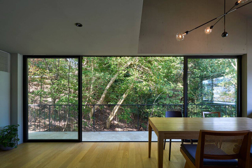 airhouse's wooden home floats above a steep slope in the japanese forest