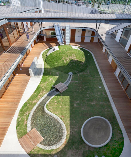 the overall concept of the 1,000 sqm scheme was to facilitate 160 children in a secure and generous space easily accessible to outdoor playing. this led to the offices, admin, staff and kitchen being arranged on the outer perimeter between the entrance and nursery to ensure convenience and security. a man-made playground has been placed in the core of the a circular ring-shaped structure that is opened to the sky. along with planted greenery, decking, tunnels, slides and bridges – the courtyard is a popular and prominent area within the kindergarten.