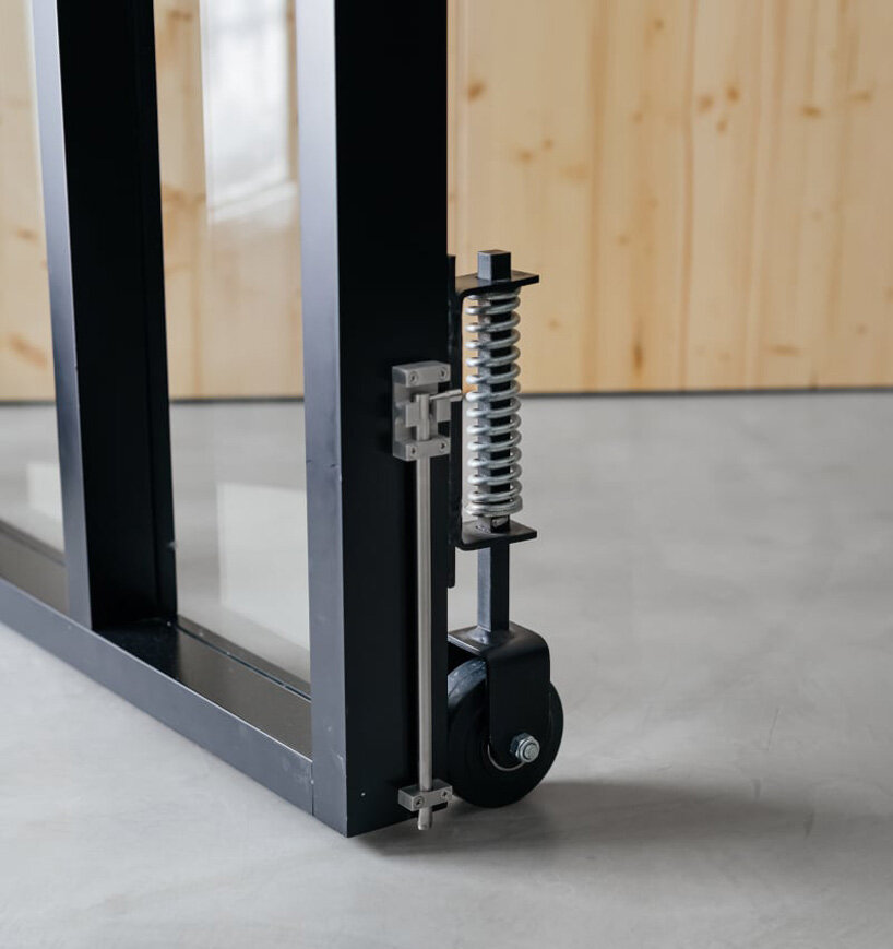 To bring ample natural light into the office and ensure transparency and openness, a glass partition wall with a wooden beam structure painted in black was created. To define the main room as an orthogonal space the partition was also extended to the other side, creating a small meeting room.