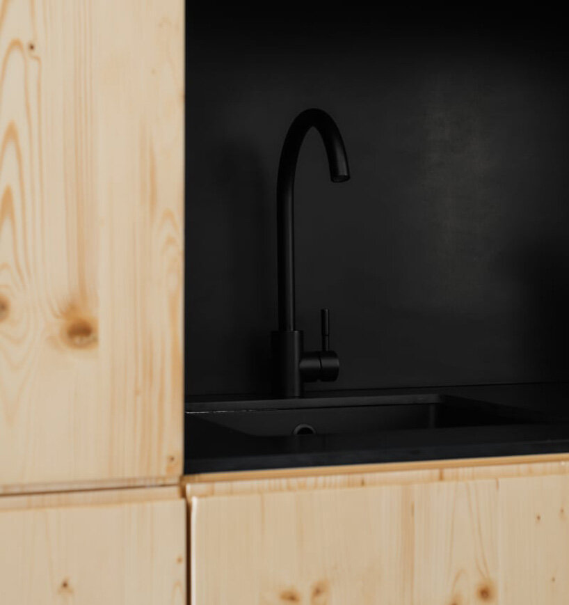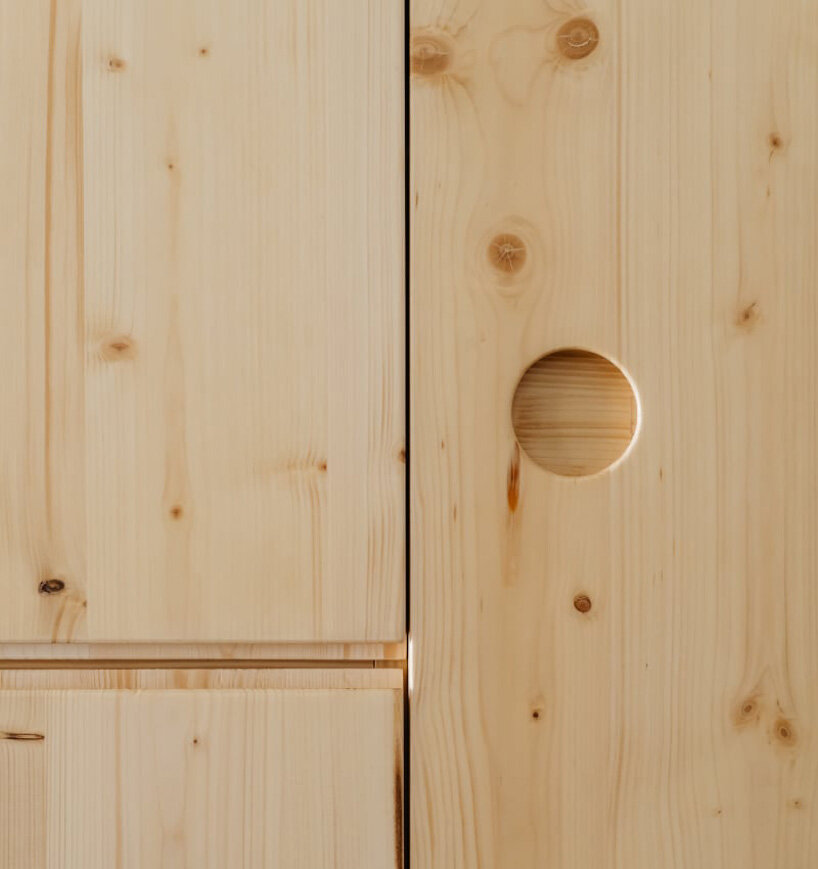 Restoring a sense of coherency, openness, and geometry, the architects created a definitive wall that doubles as a spatial partition and also contains within it amenities such as a pantry. Its natural pine wood surface permeates warmth throughout the space and contrasts with the industrial finish of the continuous cement floor. Both materials together alongside the transparent glass walls and mint green beams enliven the space and create an airy interior.