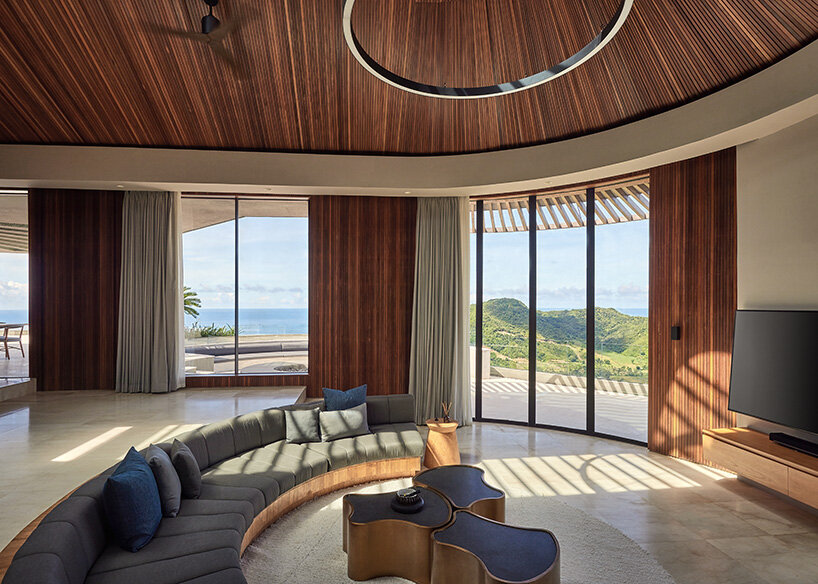 Alexis Dornier uses circular forms that correspond to shared spaces such as lounges, dining areas, and fireplaces. These communal zones sit at the core of the German architect’s composition, while more private wings branch outward to accommodate two families. At the highest point of the site, a circular yoga platform crowns the sequence, opening the architecture fully to the horizon and reinforcing the project’s vertical dialogue with the terrain.