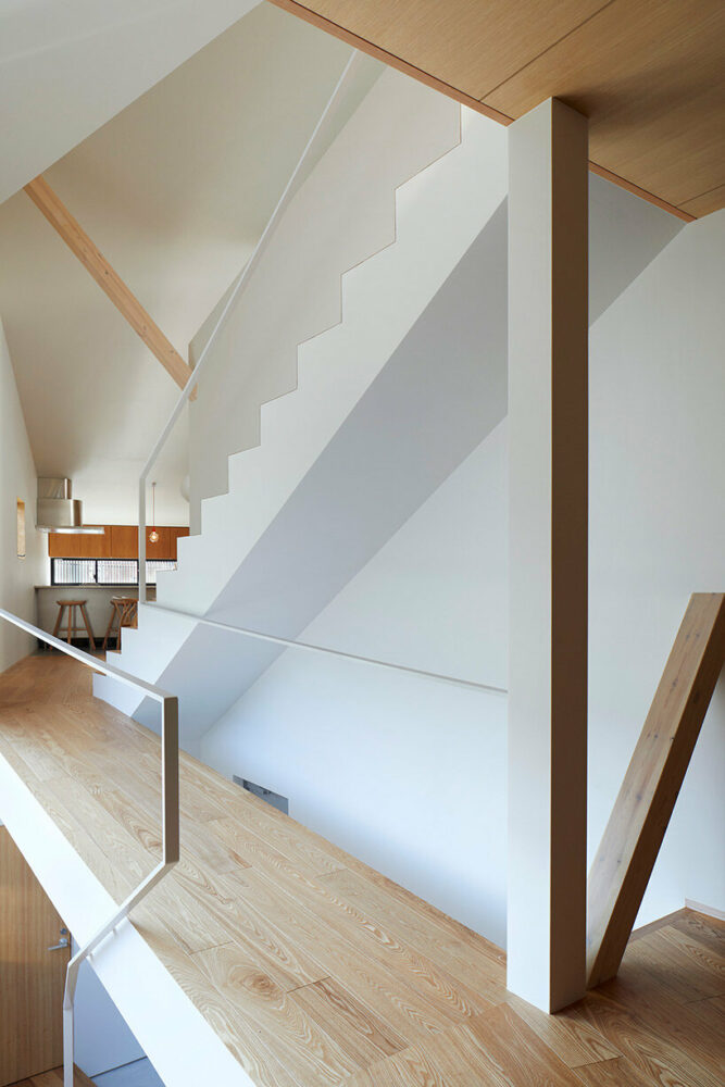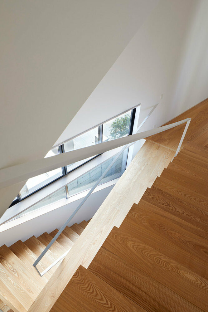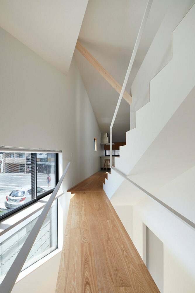 An axis inclined to the urban grid was introduced into the carving as an auxiliary line so that it extends diagonally across the property to the busy Teramachi Street, which the house faces, allowing the view from inside the house through the outdoor spaces to the city and allowing light and wind to penetrate the interior of the house. ‘This is a three-dimensional Tsuboniwa garden.’ explains the team at Alphaville Architects (find more here). To allow the passage of people, visual axes and nature, from the first to the third floor on the inclined axis, no load-bearing walls were installed, but simple hanging struts.