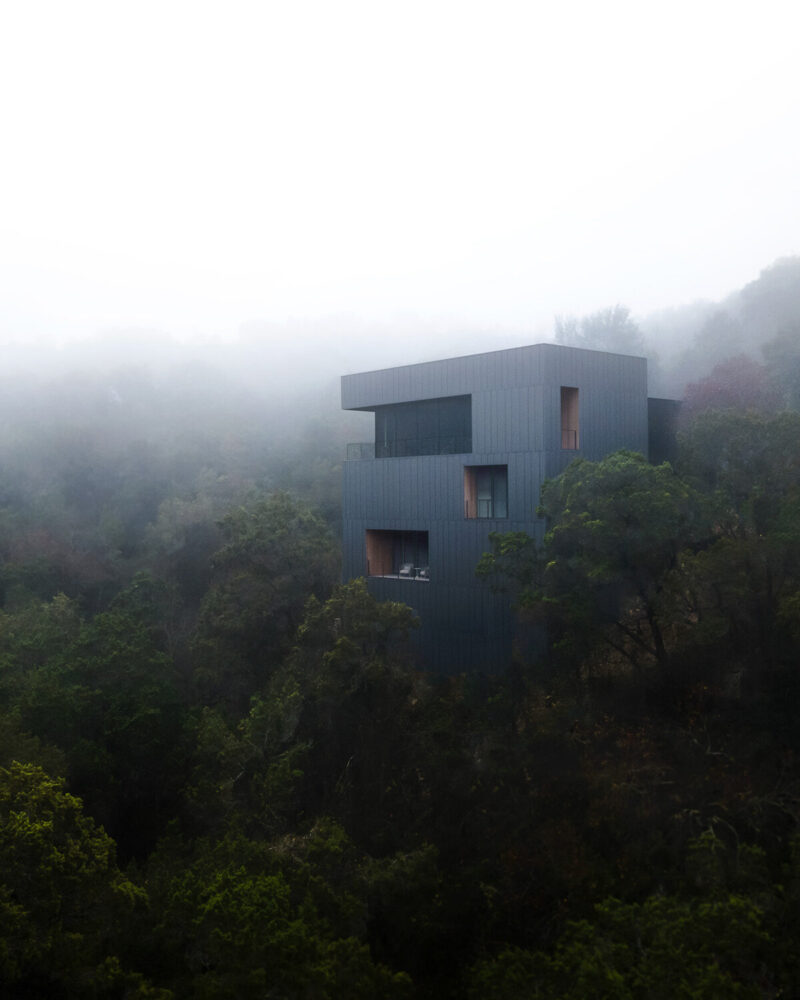 alterstudio's falcon ledge residence climbs a steep ravine outside austin, texas