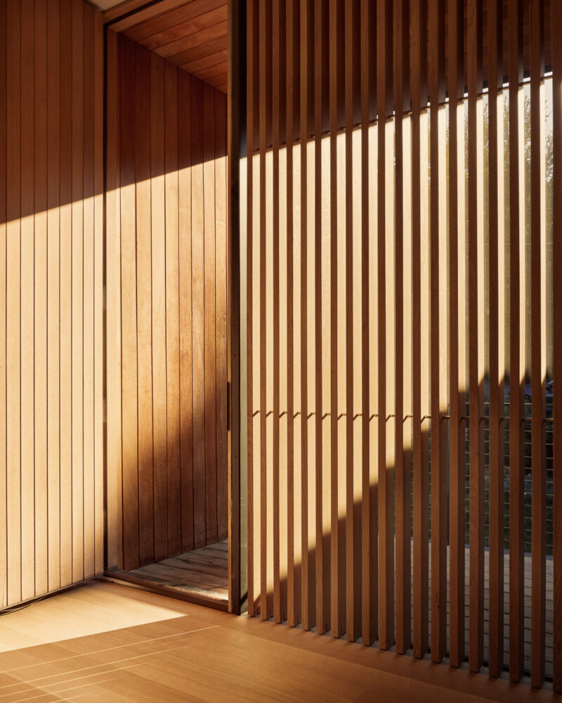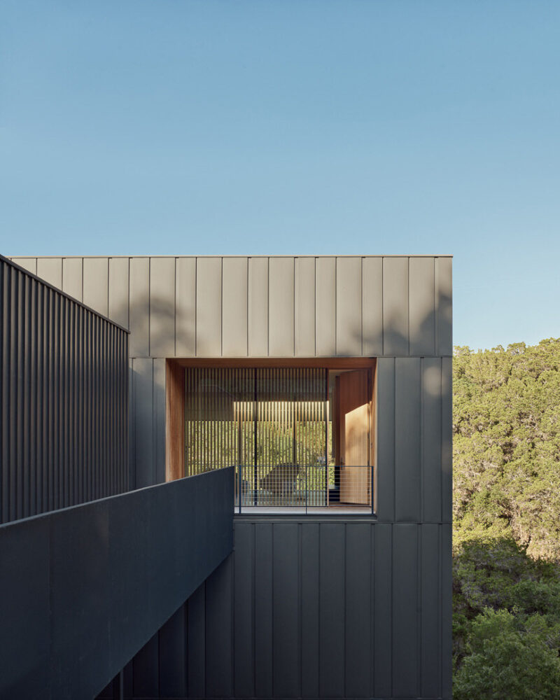 The exterior of the Falcon Ledge Residence is wrapped in vertical steel panels that Alterstudio employs to resist weathering and change tonally with time and light. These are punctuated by deep, strategic recesses that frame specific views while shading openings. The envelope is restrained but deliberate, revealing itself through precise alignments, narrow apertures, and transitions in material texture. Light enters from multiple orientations, shifting the atmosphere throughout the day and contributing to passive cooling through cross-ventilation.