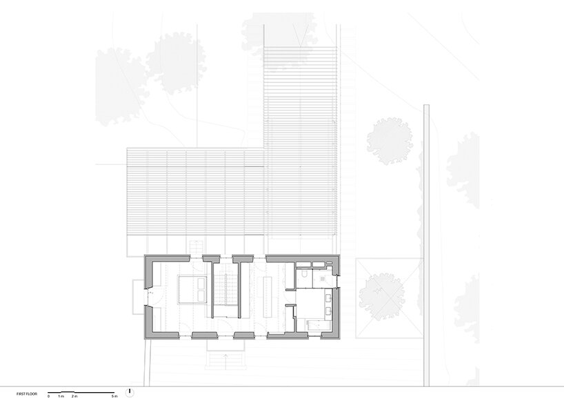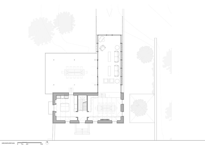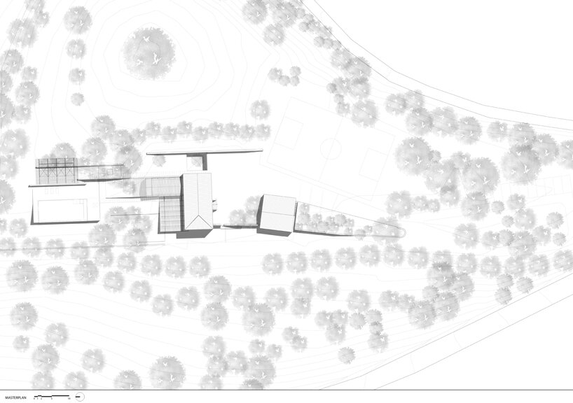 the project sits like a ring placed over the terrain, with its funnel-like roof forming a shaded perimeter walkway and an introverted core.