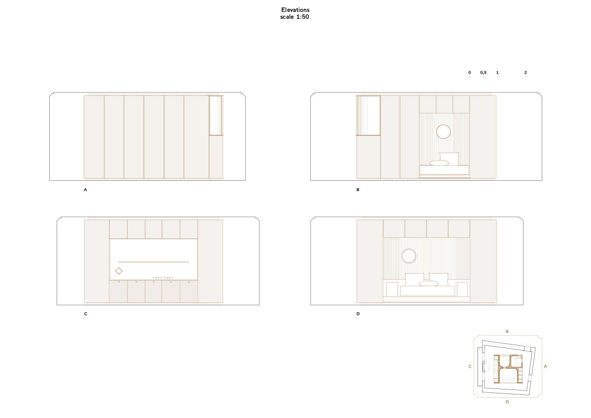 the five-meter cube occupies most of the space, clad in brass and green marble panels | image © Mikael Olsson