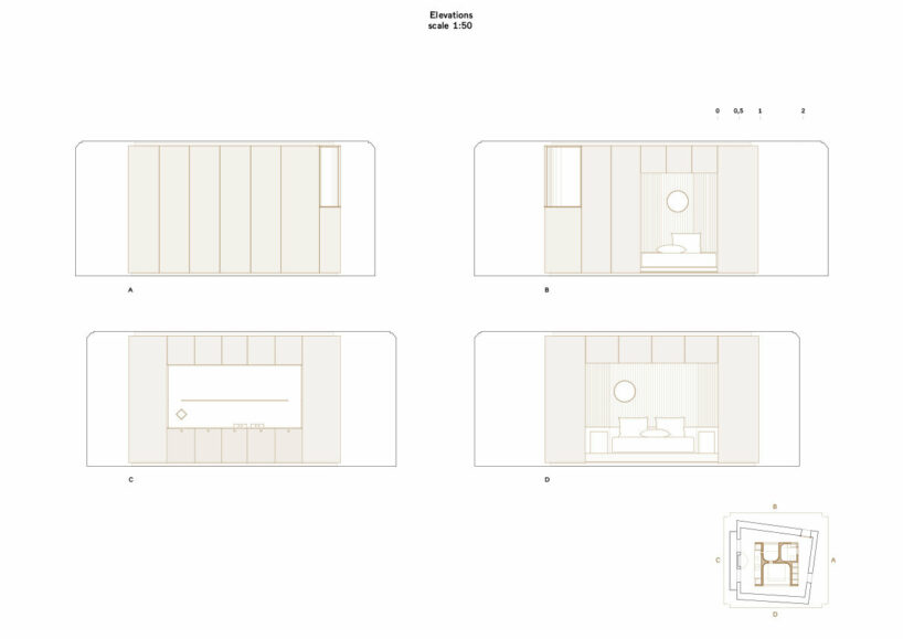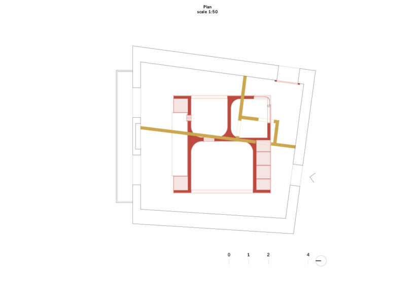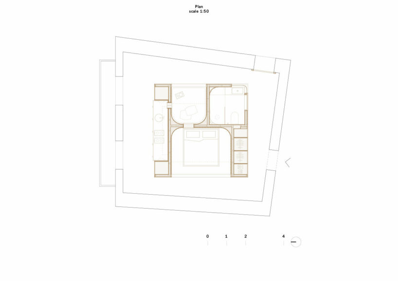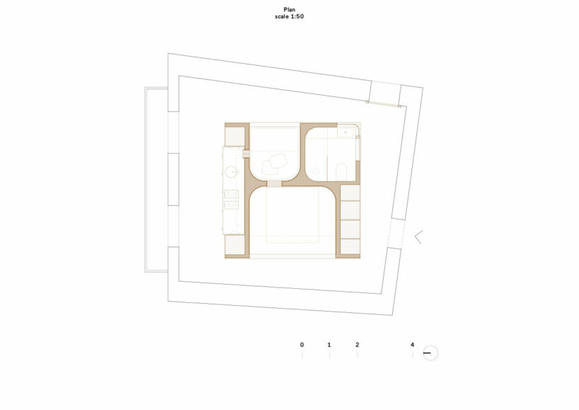 AMAA’s placement of the Golden Box within the existing structure is deliberately irregular. The architects note that it doesn’t align with the walls or ceiling elements, but rather creates a series of misalignments that generate surprising spatial experiences. This encourages exploration around the object, with the only point of alignment being the kitchen area next to two windows overlooking the main street.