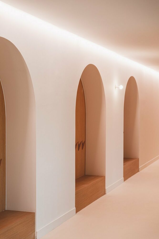 the project sits like a ring placed over the terrain, with its funnel-like roof forming a shaded perimeter walkway and an introverted core.