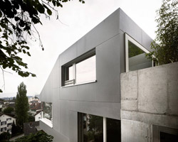 from viewing house ribetschi outside, the structure is expressed very clearly as a wooden volume sitting on top of a concrete base. partly embedded into the ground, the concrete element serves as the garage and cellar. moving up the elevation, subtle projections and recesses of the gable side façade refer to the traditional local canopy constructions. these horizontal elements are reinterpreted and combine tradition and modernity, which is enhanced by the series of windows and vertically sliding shutters.
