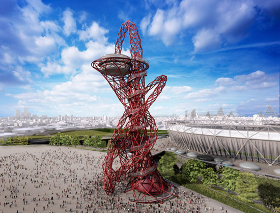 the deep red trumpet shaped tower will stand at almost 115m tall