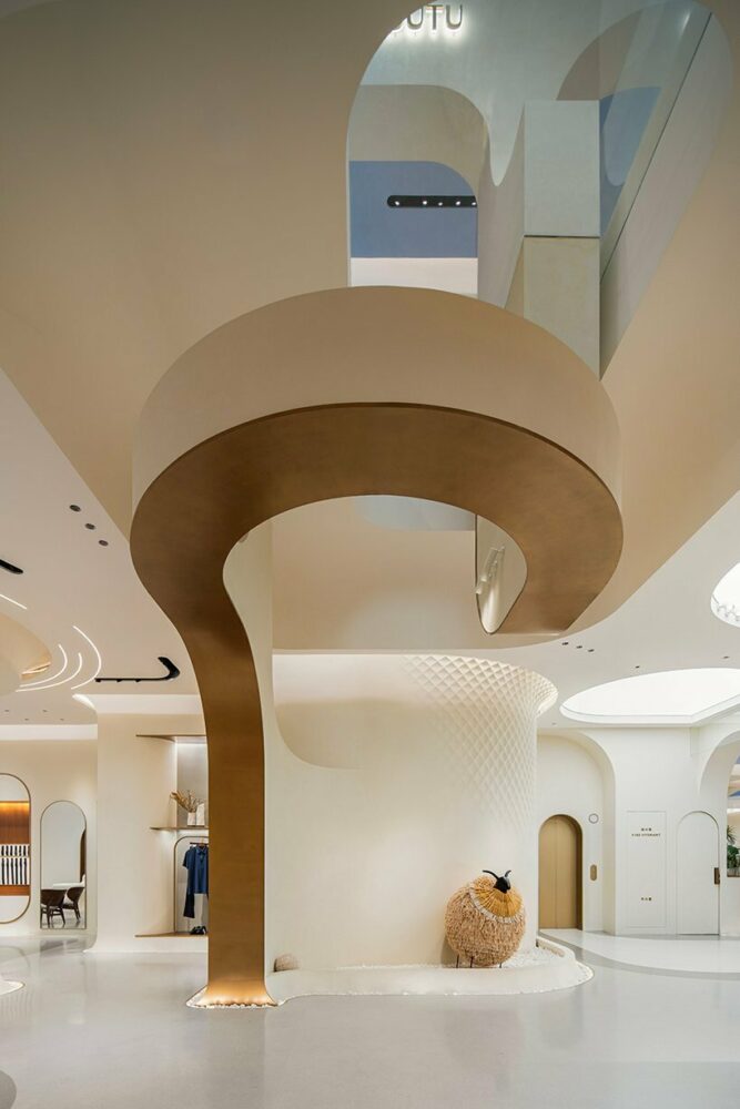 The weaving system extends from the building’s base to its summit, intertwining with the glass curtain wall louvers. This symbolic representation signifies the brand’s growth and continuous evolution. Inside the store, the organic spatial language evokes natural elements like mountains, waterfalls, and deserts, fostering an immersive experience of renewal and transcendence.