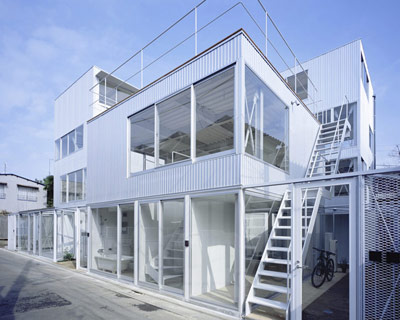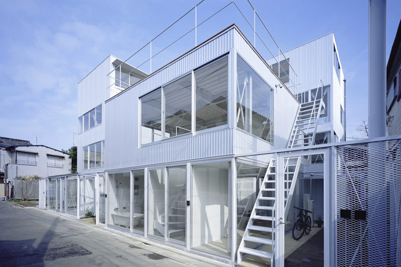takeshi yamagata architects have shared images with us of a smartly composed complex in tokyo; apartment in kamitakada is actually composed for four separate buildings linked by open-air pathways and clear lines of site afforded by generous glazing. the consolidated structure contains an impressive 9 units with an area from 30 square meters to 6o square meters.  the individual flats are divided by a series of curved walls that serve to create a network of private entrances enlivened by subtle gardens. while the heavily windowed spaces invite in the oft-charming downtown density of tokyo, ample daylight and ventilation pervade the numerous levels and give the residences an air of urban refuge. this is an architecture that resists the typical cramping of urban living with elegant tectonic decisions and choice apertures.