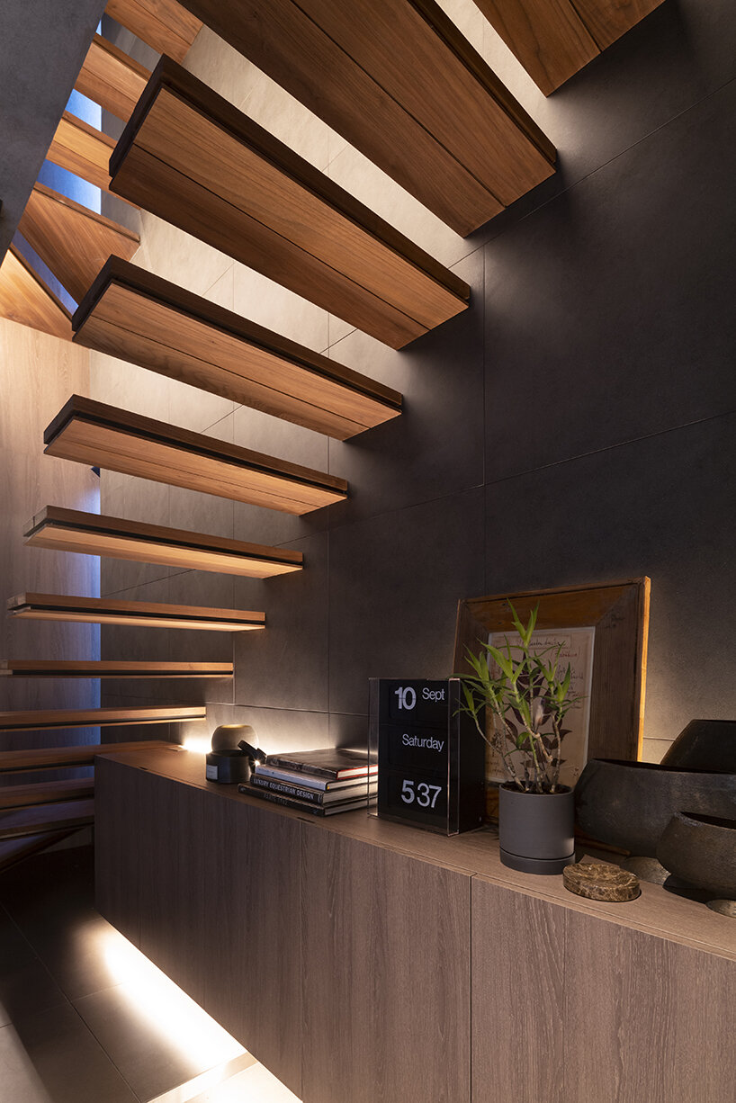 The team at Apollo Architects concentrated all functional elements — storage areas, kitchen, elevator, bathroom, and stairwell — along walls running lengthwise through ‘ESPRIT’, resulting in a minimalistic tube-shaped space with natural light and ventilation flowing along the north-south axis. The rooftop, accessible through the top floor, has a garden with an outdoor kitchen, furniture, and a sculptural pergola. Finally, linking indoor and outdoor living spaces and enclosing them with greenery results in a serene atmosphere that is snugly private while still offering attractive views.