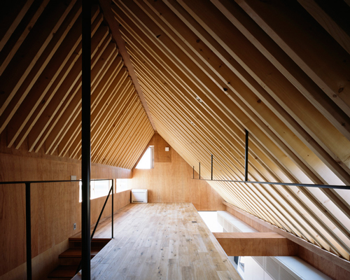 taken from the idyllic designs by alvar alto, the client asked apollo architects to design his family home in japan with influences from the small churches he saw during his travels to northern europe. named ‘nord’, the flag-shaped property (a rectangular site with a pole-like narrow path) focuses on using timber to give the spaces inside warmth and intimacy, most noticeably on the ceilings. the property is surrounded by neighboring properties all round, and with the awkward site, this presented strict regulated setback from three directions, which in turn has created the asymmetric form of the roof.