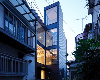 a former client of japanese architecture firm apollo architects + associates commissioned a house for herself and her husband on a narrow site near tokyo skytree. the dwelling is located at the end of an ‘alley’ in a busy neighborhood of the japanese capital city. due to physical constraints of the site, a tall thin timber frame structure was chosen for the design. in order to blend with the context, a soft brown galvanized metal skin was chosen for the exterior.