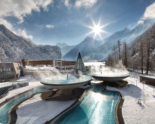 a resort set amid the impressive austrian landscape has been redeveloped using angular and tapered forms to reflect its mountainous setting. the ‘aqua dome‘, which accommodates 350,000 visitors each year, has been designed to be a distinctive landmark for the region, while simultaneously providing guests with a familiar alpine atmosphere.