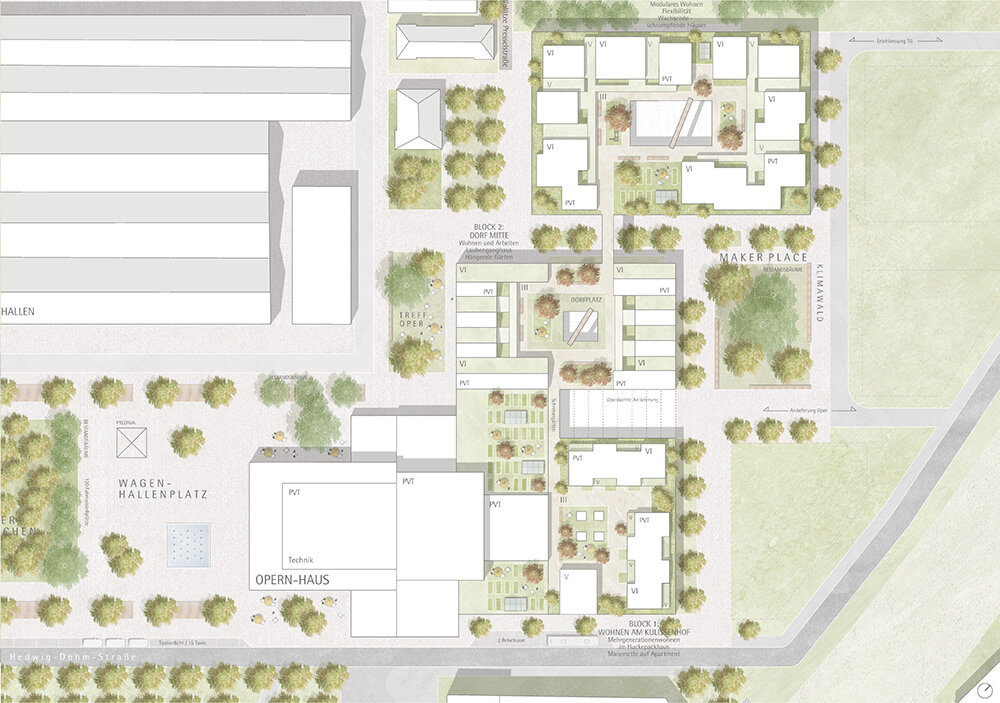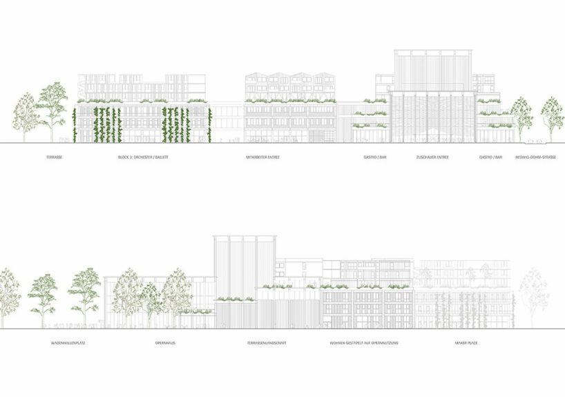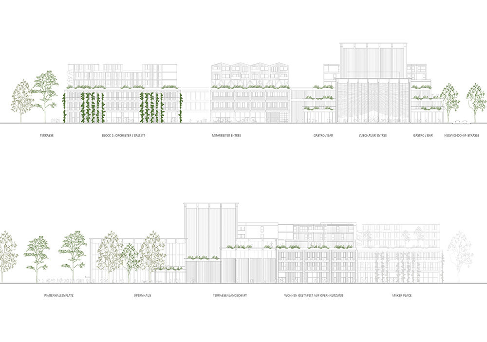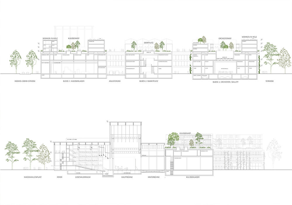 The new complex will feature the Back of House area, essential for large-scale productions, offering rehearsal spaces, workshops for stage set production, offices, prop, and scenery storage, and more. Spanning three city blocks, this arrangement will cater to the diverse needs of the theater. The opera roof will also serve as the foundation for an innovative residential development, creating an elevated village with a vibrant ground level. Once the opera and ballet return to their original venue, the production spaces will be repurposed as a ‘makers city,’ contributing to the vision of establishing a mixed urban environment. This project is part of the international building exhibition IBA’27, aiming to integrate production and living spaces to foster a dynamic urban condition.
