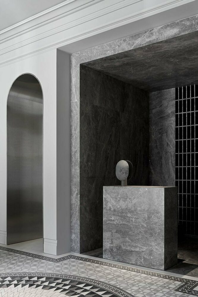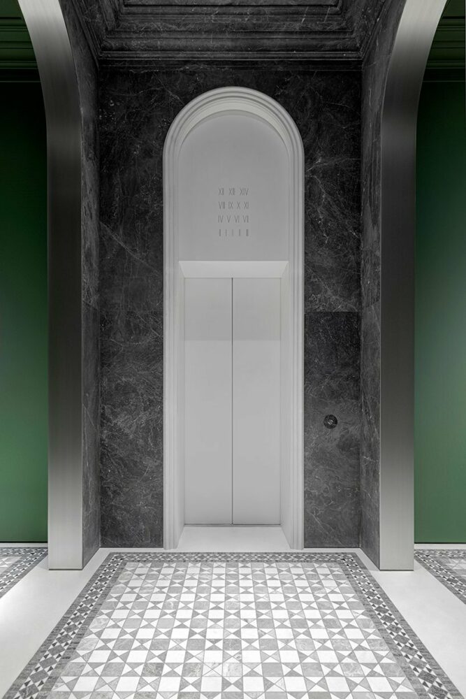The facade concept by the Moscow-based architectural office, Tsimailo Lyashenko and Partners, was developed in cooperation with the French agency Antonini + Darmon Architectes. The image of a classical building by the water, with its arched galleries, evokes Venetian palazzi architecture. The building forms as a dedication to the Jewish Russian-American poet Joseph Brodsky and his adoration of Venice city, hence the name of the building. The concept is furthered by repeating the arched elements of the facade in the interiors of the two lobbies. The internal arrangement displays monochrome tonality with a wide variety of gray hues. Smaller and larger lobbies are distinguished from each other by the addition of deep green features. Drawing from traditional Italian patterns, the floor mosaic flows throughout the structure. ‘Brodsky’ residential block accommodates 65 apartments varying between 100 and 600 sqm, as well as a wellness center, a kids club and playground facility, and underground parking.