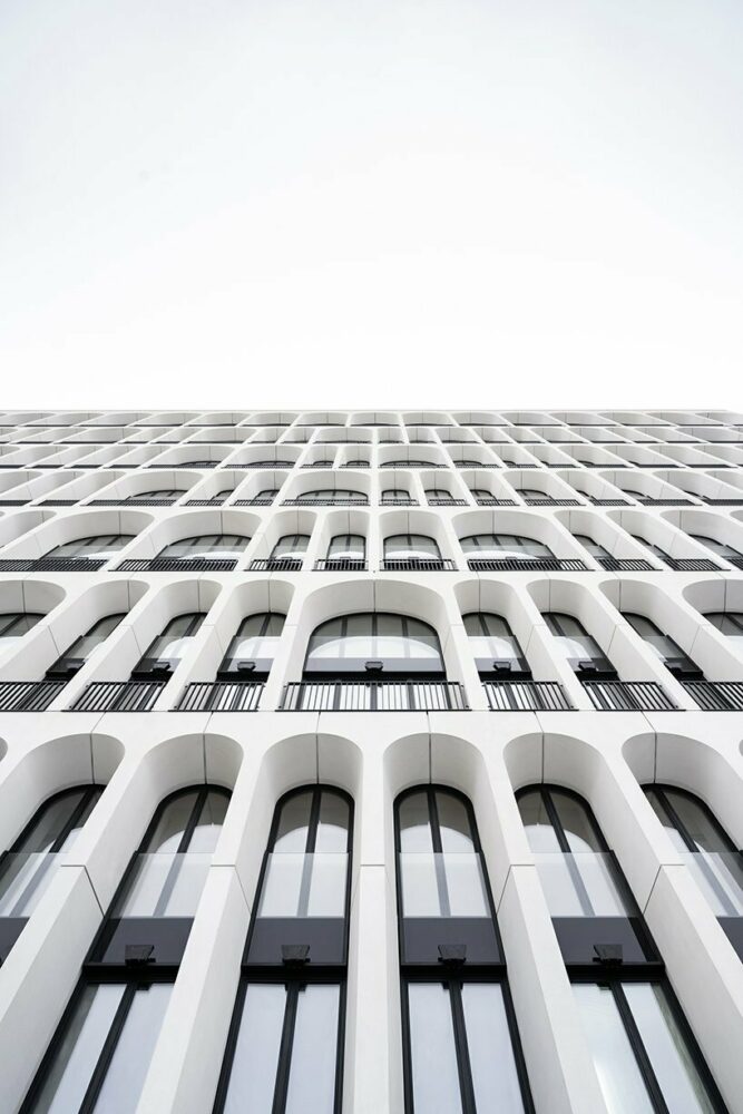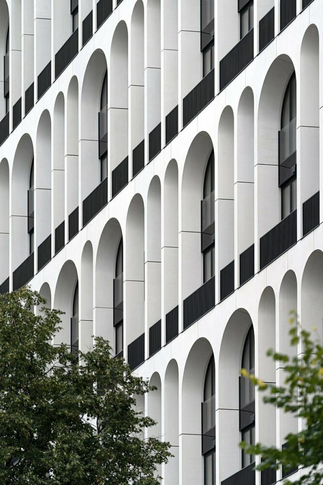 the structure expands in 14 levels of height enfolding in an arched patterned facade