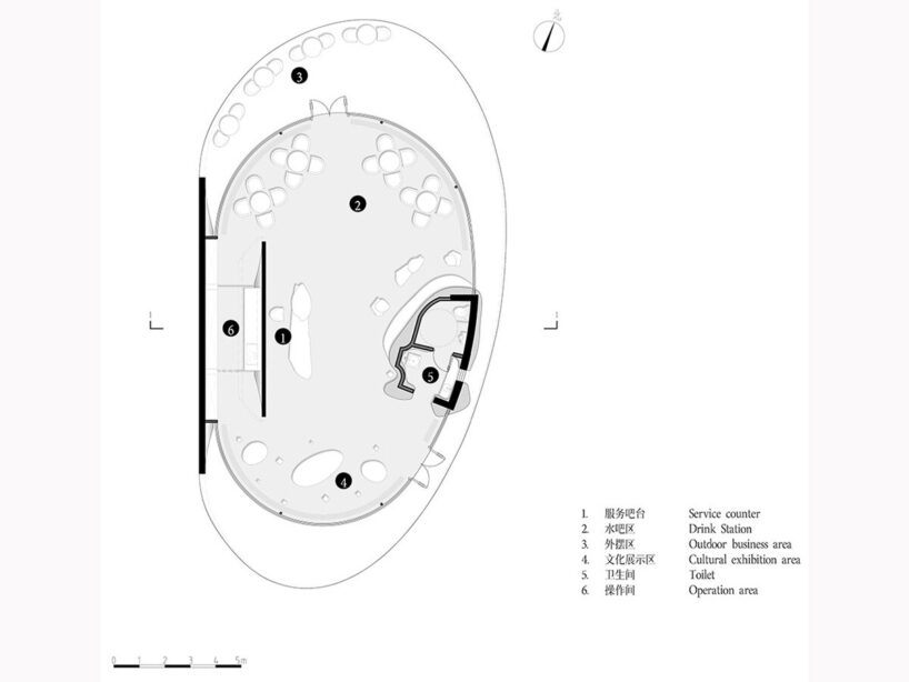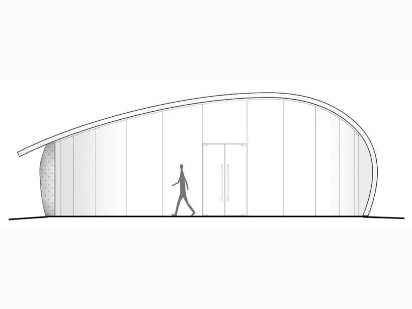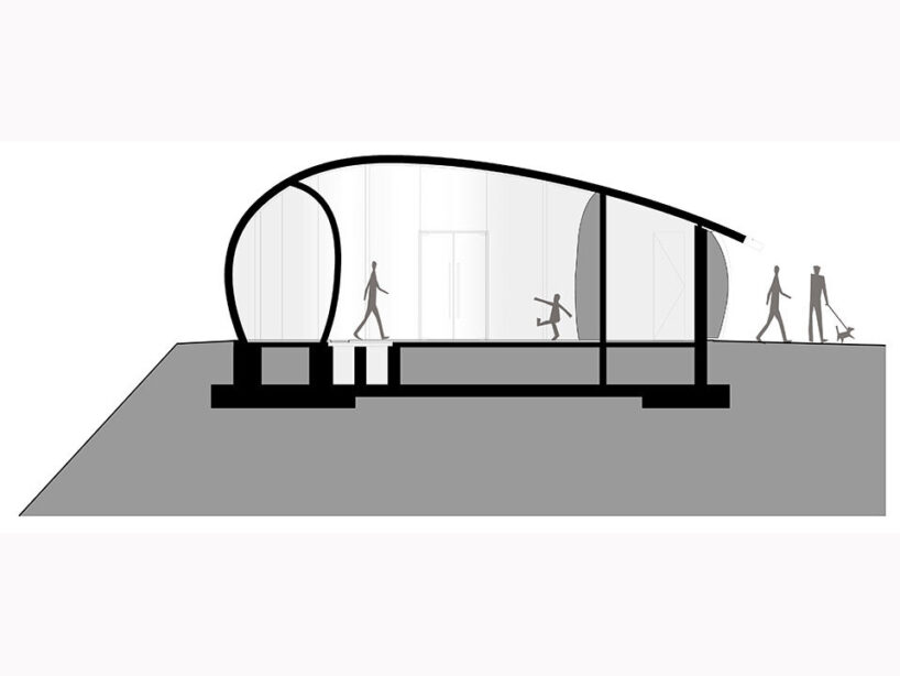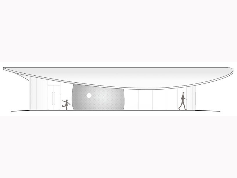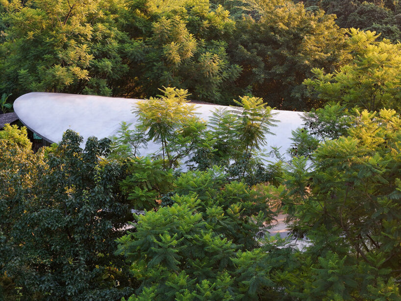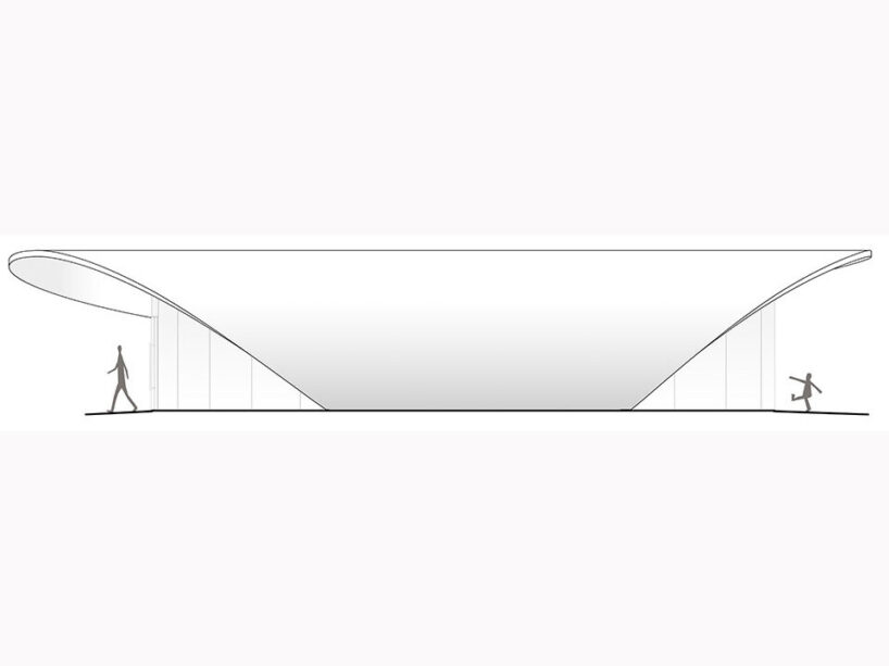 the project sits like a ring placed over the terrain, with its funnel-like roof forming a shaded perimeter walkway and an introverted core.