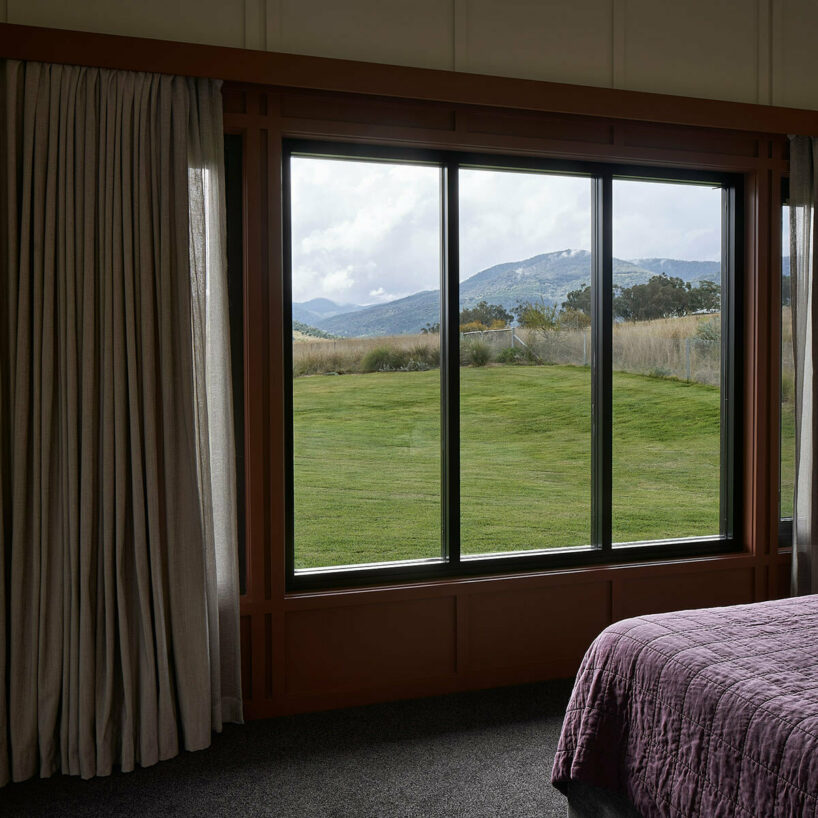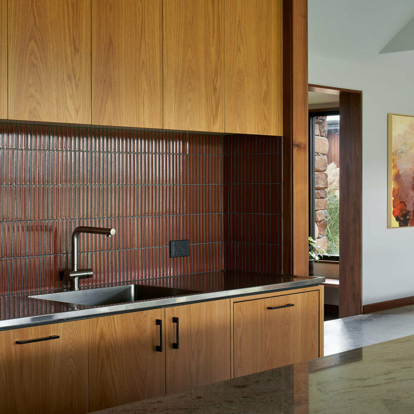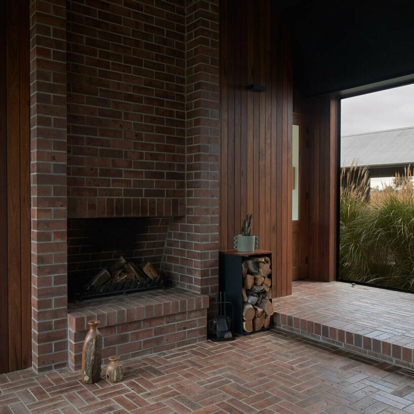 With its organization and materiality, MRTN Architects’ House in the Dry departs from Australia’s typical suburban typology. The architects instead embrace an agricultural aesthetic, employing a metal roof and walls built from metal, timber, and stone. These materials were selected for their unobtrusive nature, including a subdued silver roof, black sheets, and ironbark timber. Inside, interior spaces are finished with painted plasterboard, timber in the kitchen, and tiles in the bathroom, while the walls of the central courtyard are finished with brick, timber, and stone.