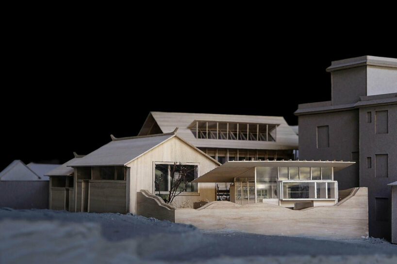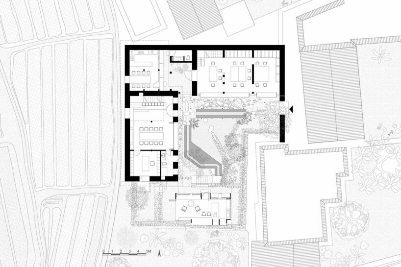 the project sits like a ring placed over the terrain, with its funnel-like roof forming a shaded perimeter walkway and an introverted core.