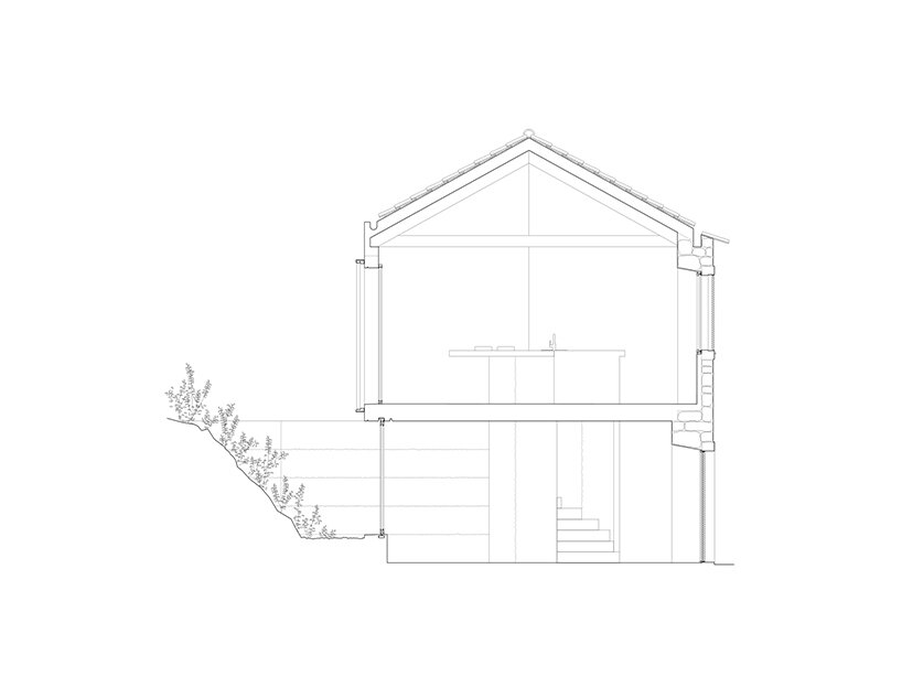 The upper floor of the renovated building has four large window bays, two of which also reach down to the ground floor, forming two patios. ‘This means that the bedrooms can be moved downstairs, along with the wet rooms; thus, the main upper floor, which is now completely freed up, becomes a large shared space connected to the estate. In turn, it is presided over by a staircase crowned by the kitchen that articulates the space,’ writes the Arquitectura-G team.