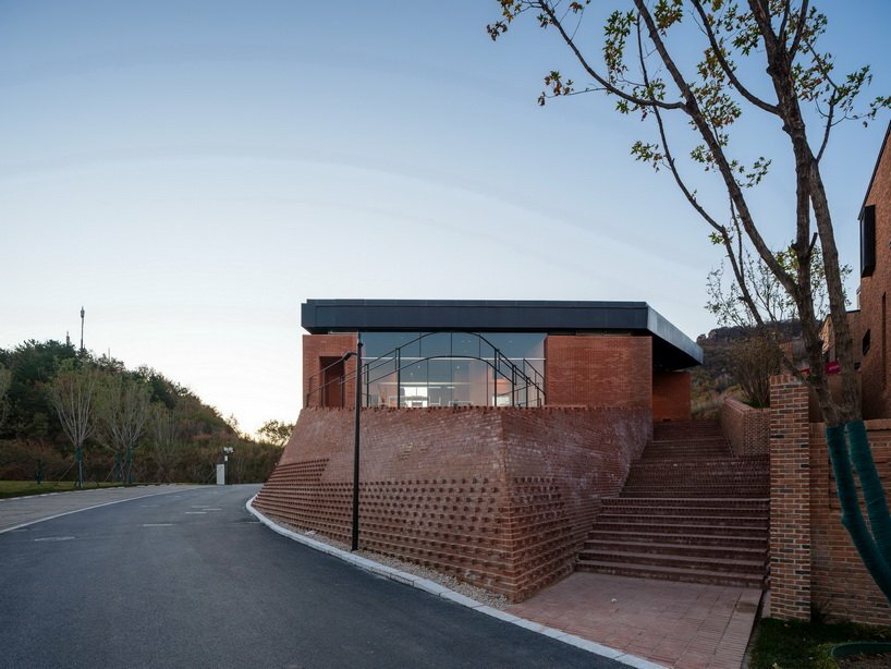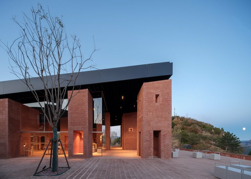 the project sits like a ring placed over the terrain, with its funnel-like roof forming a shaded perimeter walkway and an introverted core.