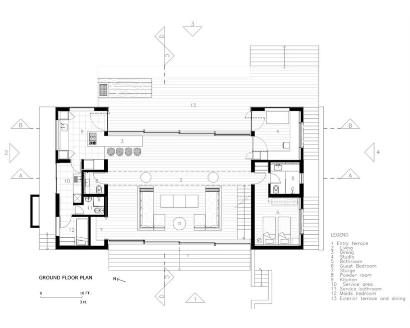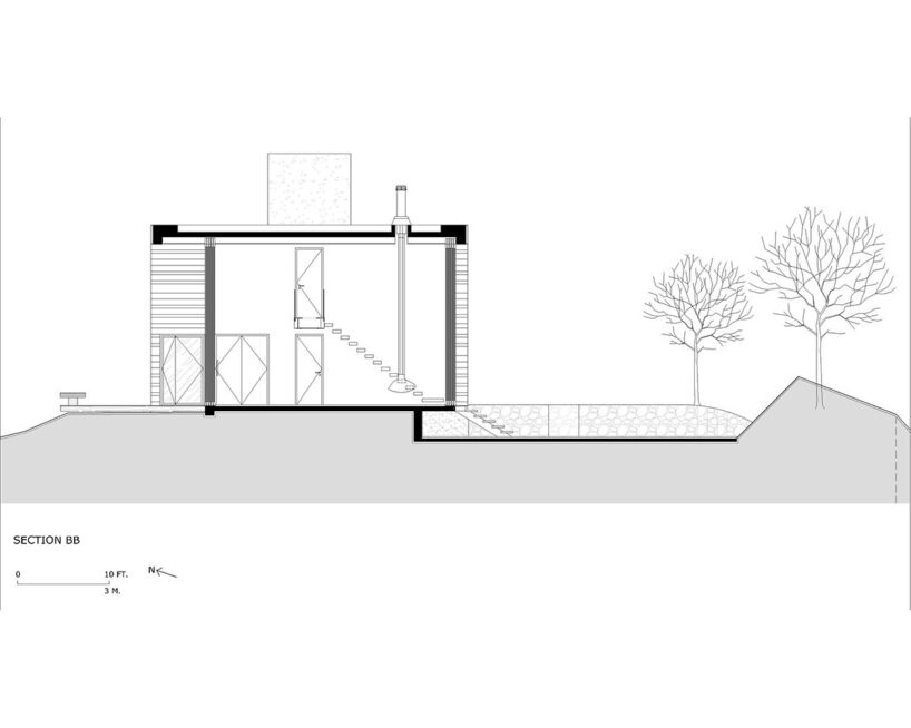 The plan takes the form of two symmetrical cubes framing a lofty central volume. Inside, lofty ceilings rise 11 meters (36 feet), and continuous glass panels draw in light and views, creating a breezy and fluid connection to the trees beyond. ‘The shape is simple, symmetrical, easy,’ Casas notes. He contrasts the home’s subdued form with with the ‘entropic, messy profile’ of the forest that surrounds it.