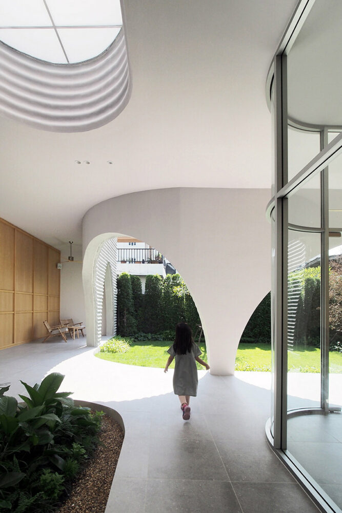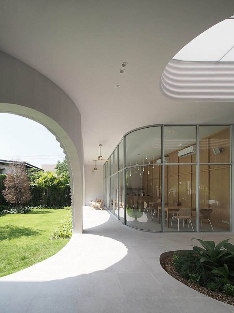 In Bangkok, Thailand, sits the new Khao Niao Restaurant + Onda cafe with an eye-catching facade. Designed by ASWA, the L-shaped and one-story eatery reveals a precast concrete exterior with corrugated surfaces that angle sharply at the front and bend softly like a wave at the back — a striking feature that is set to become a popular attraction in the area. Punctuating the solid gray facade is a series of arched openings and windows that let light and wind pour through.